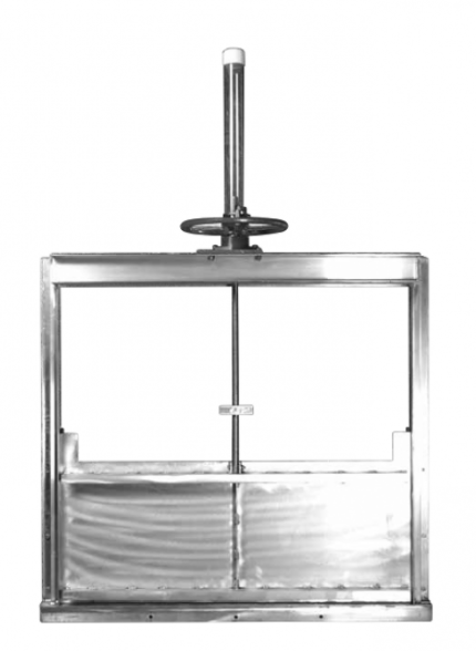 Many treatment plants require downward-opening fabricated gates to permit a rough measurement of flow or to maintain a constant upstream water elevation. For these installations the gate slide opens downward to allow the flow of water over the top of the slide or weir plate. Either manual or electrically actuated lifting devices may be utilized. Weir gates may be self-contained or not self-contained.